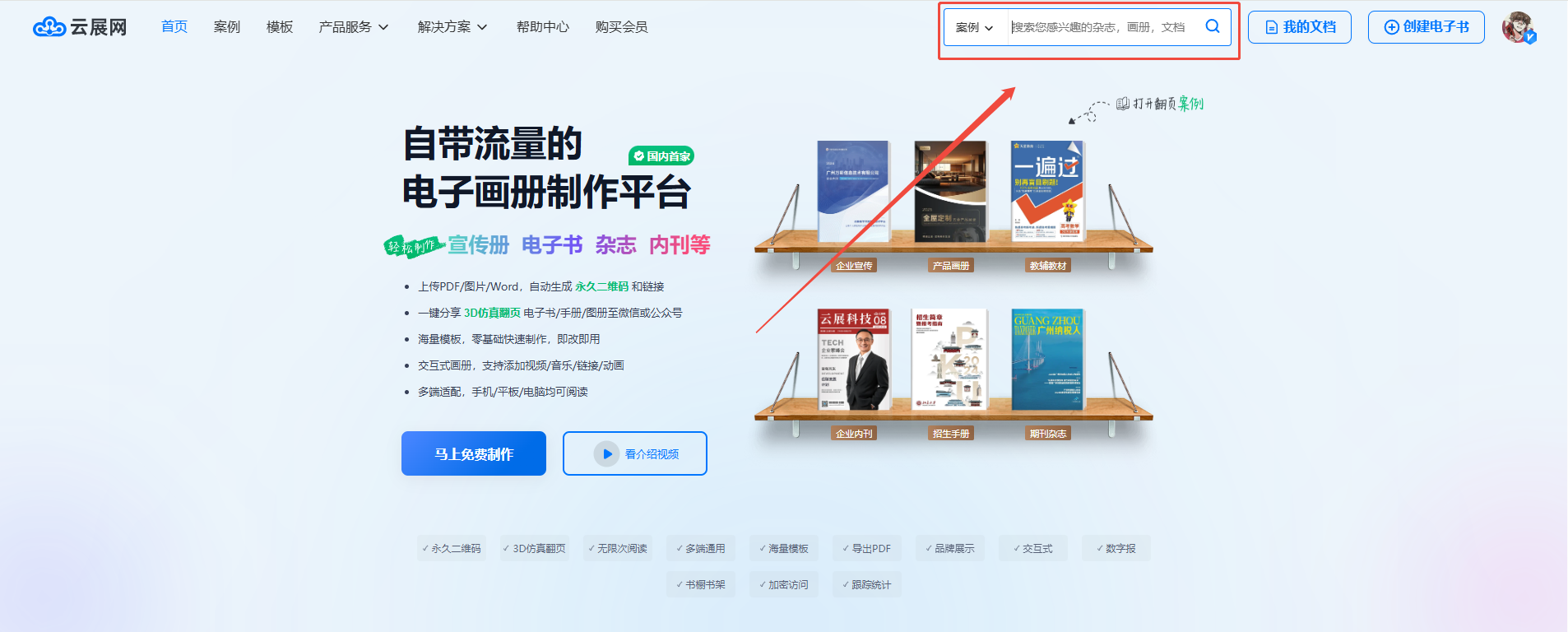 電腦上用瀏覽器打開云展網(wǎng)官網(wǎng):http://m.1061937.com/,點擊上方搜索圖標,輸入關(guān)鍵詞搜索。