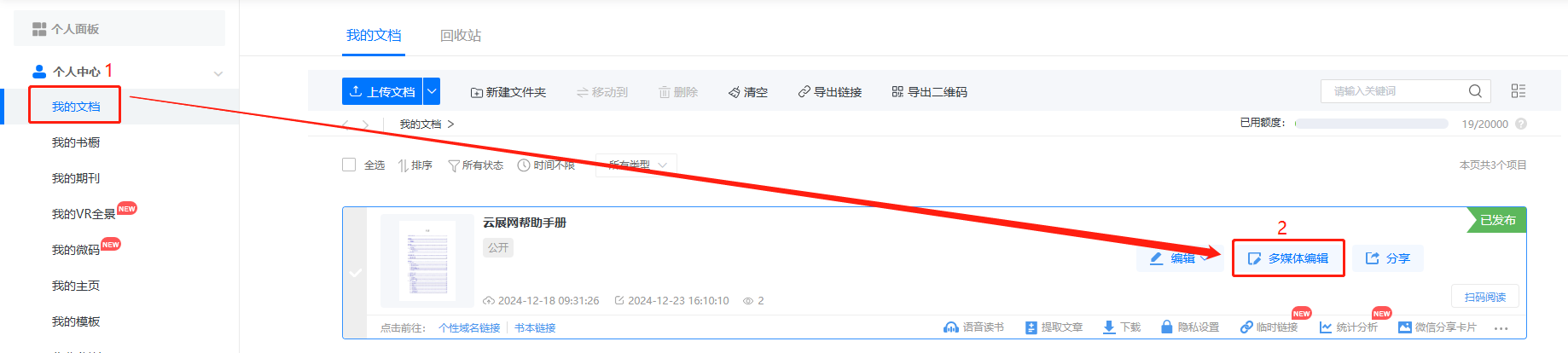 點(diǎn)進(jìn)【我的文檔】/【文檔】,選擇對(duì)應(yīng)電子書(shū),點(diǎn)擊【多媒體編輯】/【內(nèi)容編輯】。