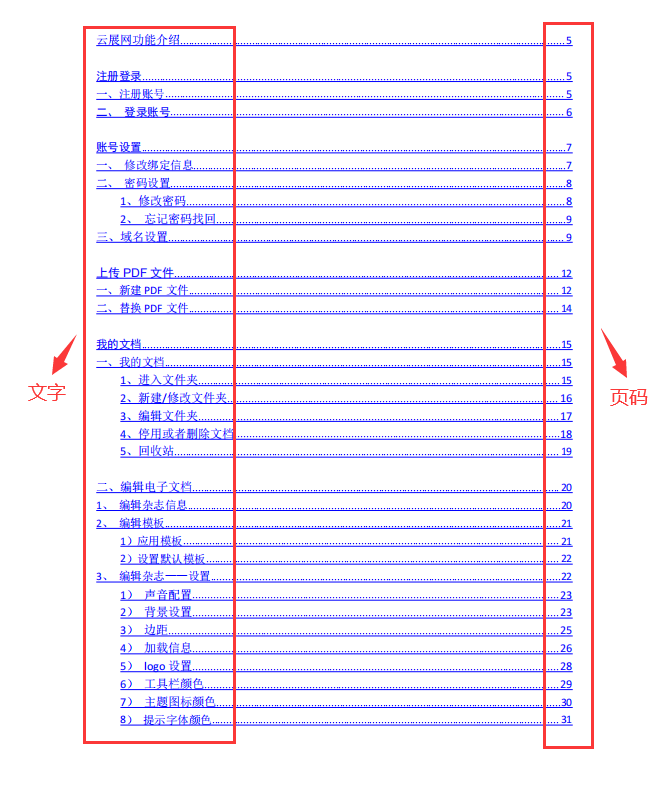 注意:多媒體編輯器里自定義添加的目錄頁(yè)暫時(shí)無(wú)法識(shí)別,必需是上傳pdf制作的電子書(shū),并且pdf上有目錄頁(yè)才能識(shí)別,目錄必需是文字+頁(yè)碼的組合,如下圖: