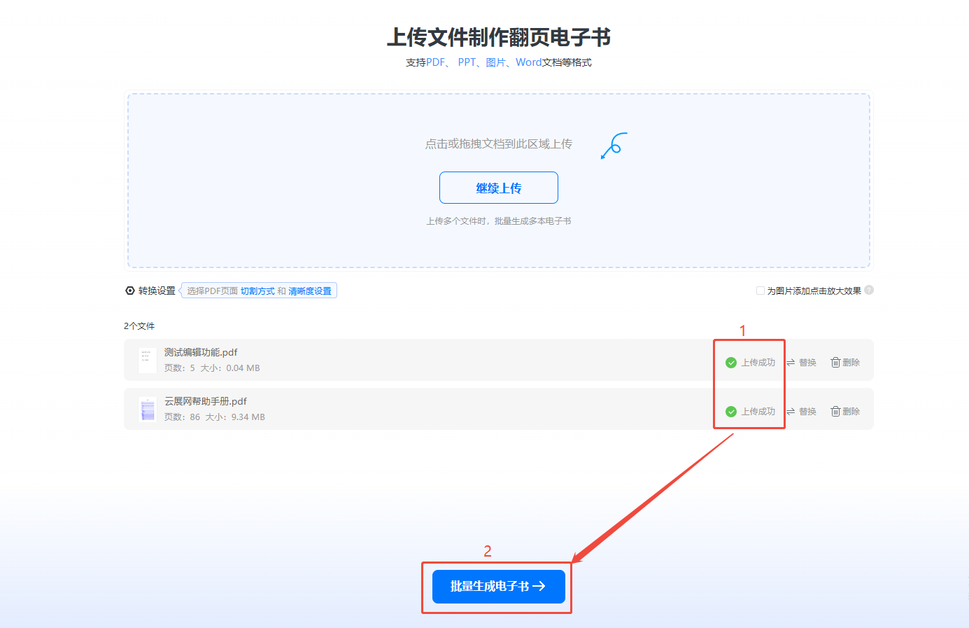 當(dāng)顯示【上傳成功】時,點(diǎn)擊下方【批量生成電子書】,電子書開始生成。