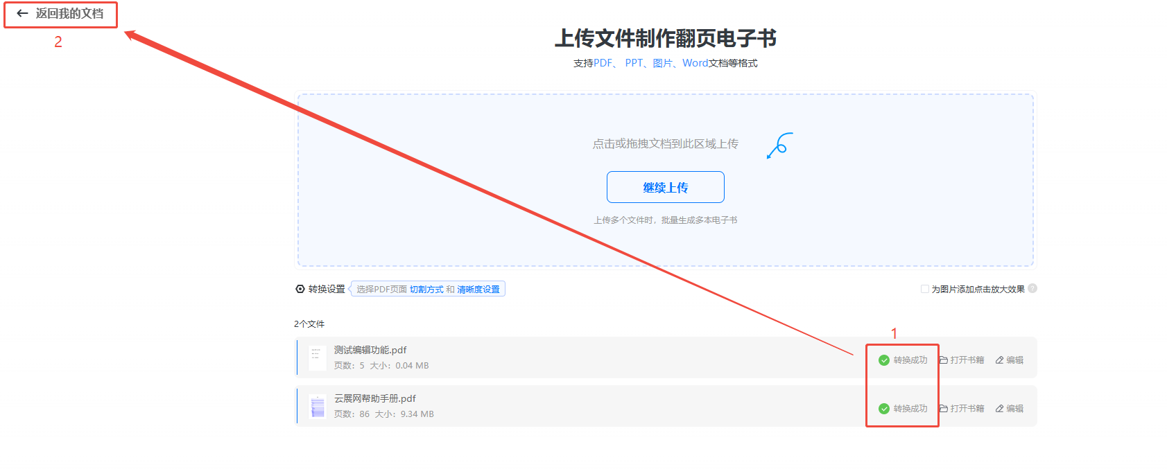 當(dāng)顯示【轉(zhuǎn)換成功】時,就意味著電子畫冊已經(jīng)生成了,可以點(diǎn)擊左上角【返回我的文檔】查看。