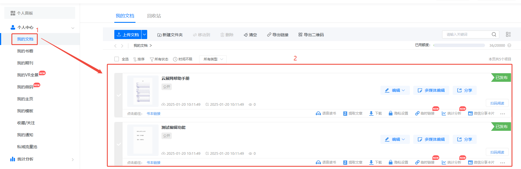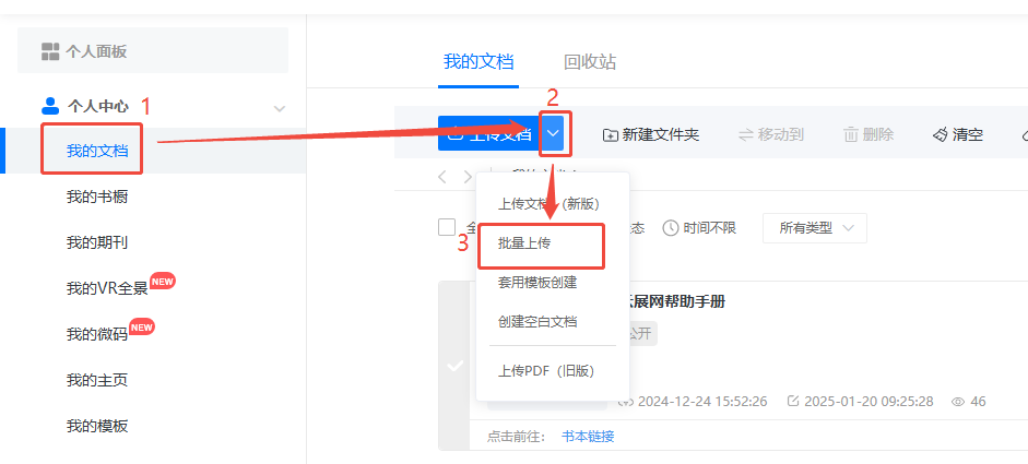 點(diǎn)擊【我的文檔】,然后點(diǎn)擊【批量上傳】,打開批量上傳界面。