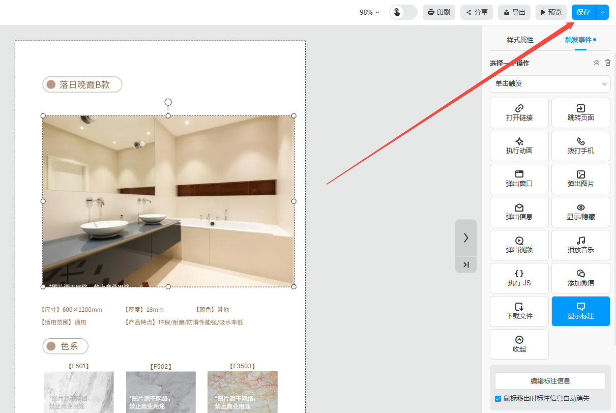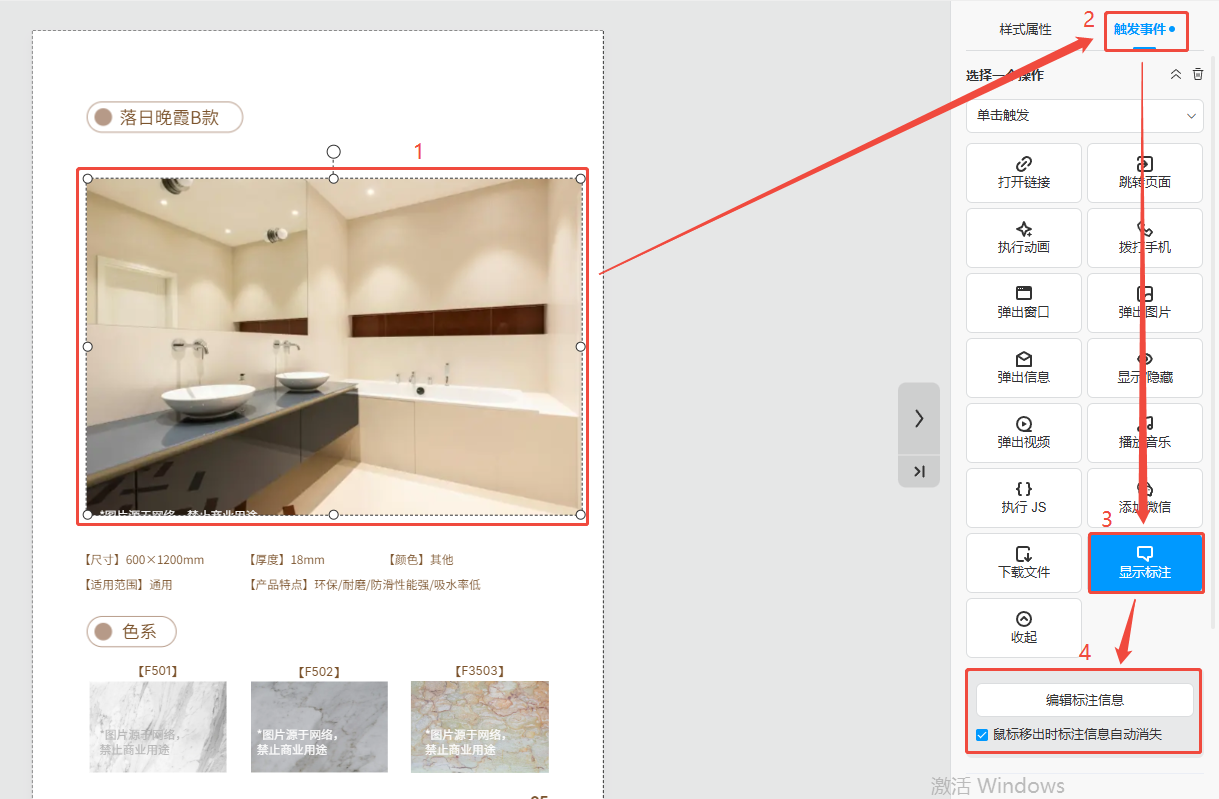 選中需要點(diǎn)擊顯示標(biāo)注的文字或者圖片,然后在【觸發(fā)事件】選擇【顯示標(biāo)注】,點(diǎn)擊【編輯標(biāo)注信息】。