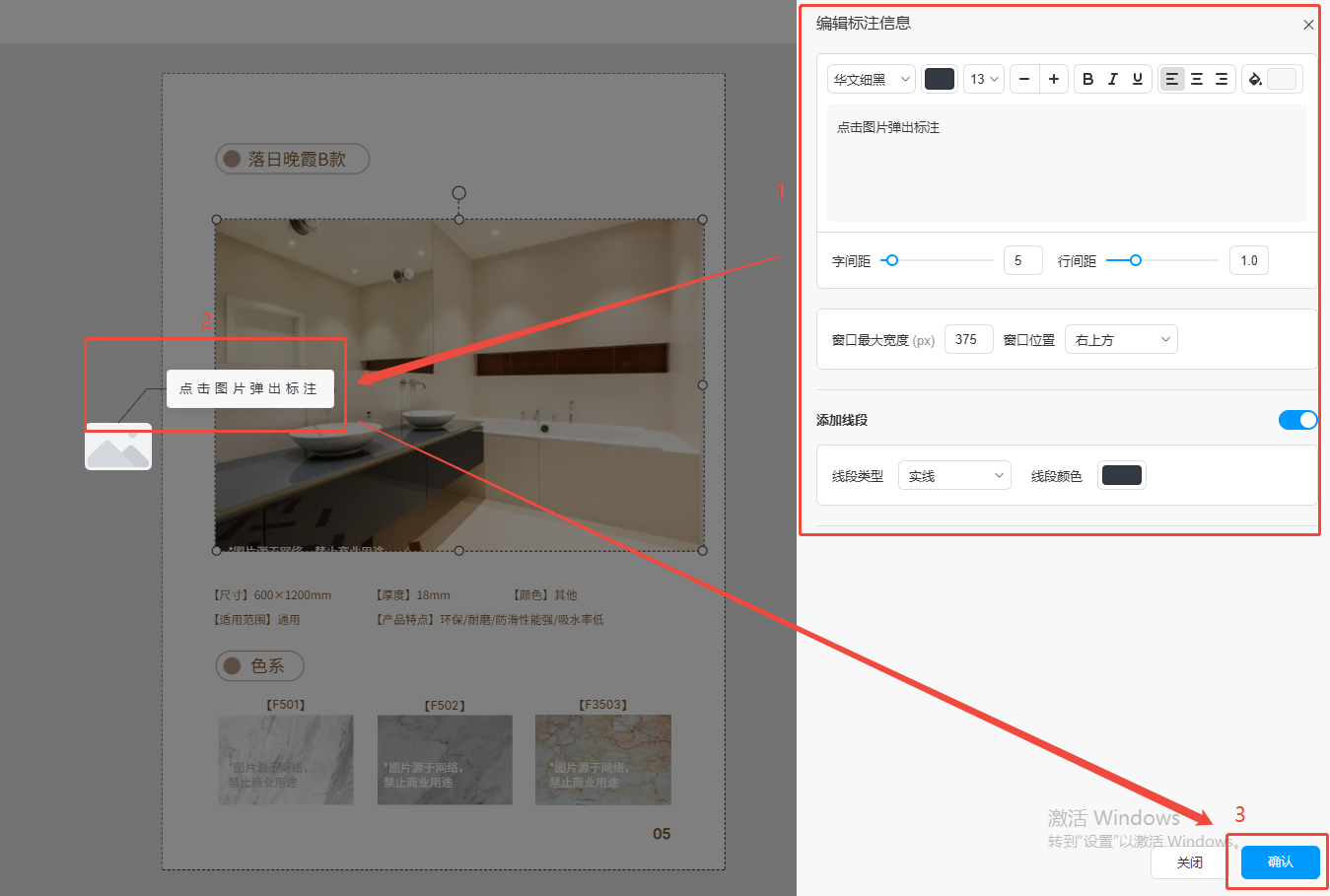 右側(cè)輸入標(biāo)注內(nèi)容,調(diào)整文字樣式,窗口大小,線段樣式,設(shè)置好之后點(diǎn)擊右下角【確認(rèn)】。