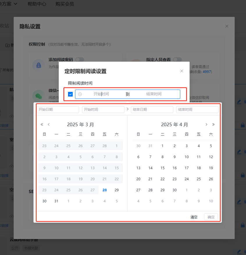 設(shè)置開啟日期時間和結(jié)束日期時間,在設(shè)置的這段時間內(nèi),書本無法閱讀。