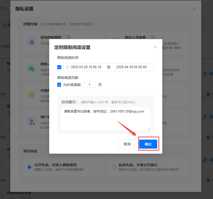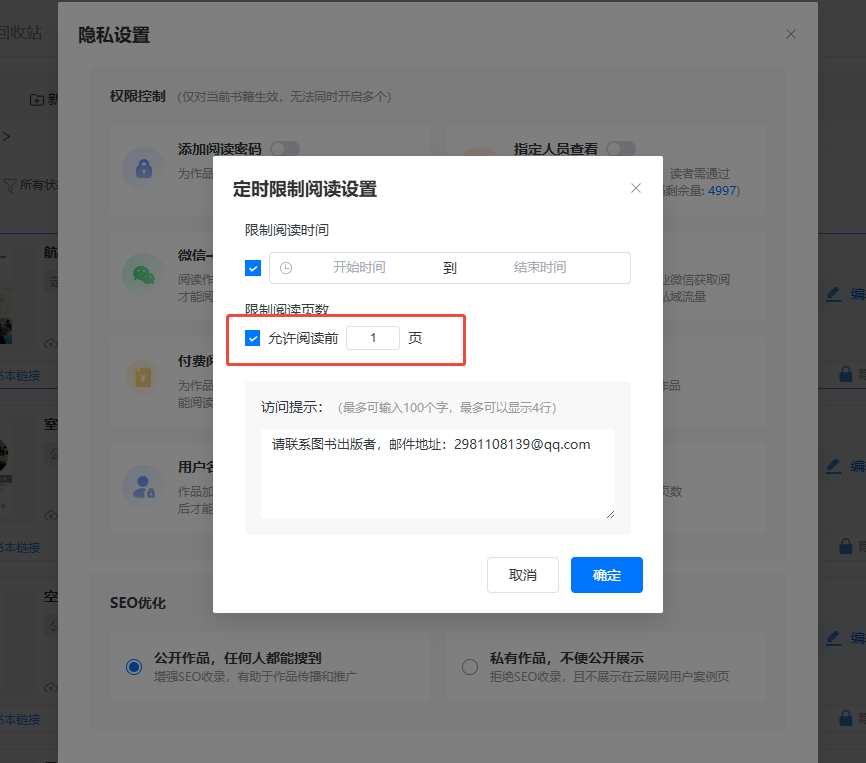 如果想要在限定的時間段內(nèi)讀者可以試看,可以設(shè)置允許閱讀前幾頁。