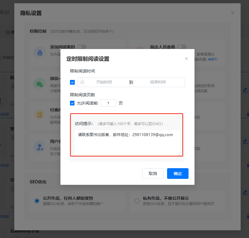 可根據(jù)你的需要,設(shè)置提示信息。比如你想讀者在無法閱讀的時候,能夠通過提示信息及時聯(lián)系到你,那你可在信息提示里輸入自己的郵箱地址。