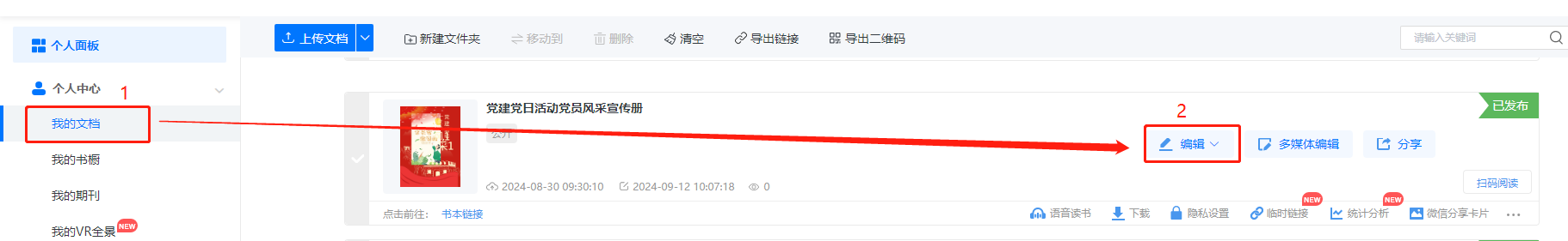 點進【我的文檔】,找到對應書本,點擊【編輯】,打開書本編輯界面。