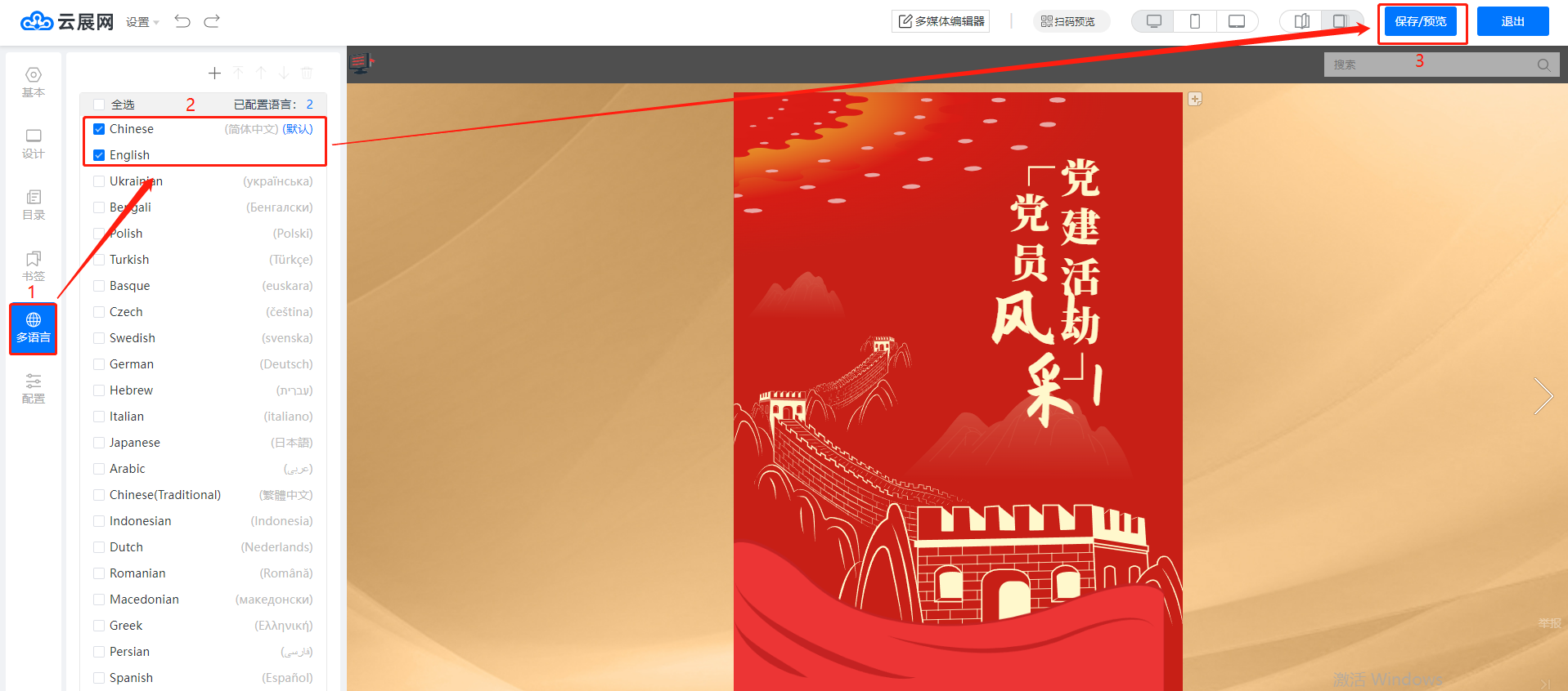 點擊【多語言】,勾選需要給讀者選擇的語種,點擊【保存/預覽】。