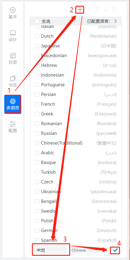 如果您希望統(tǒng)一修改文字提示,直接選擇一個語言修改即可;如果您不希望這個修改應用到所有書本,建議新建一個語言,下面以新建語言為例,點擊【多語言】,然后點擊【+】號,下方輸入名稱,再點擊【√】。