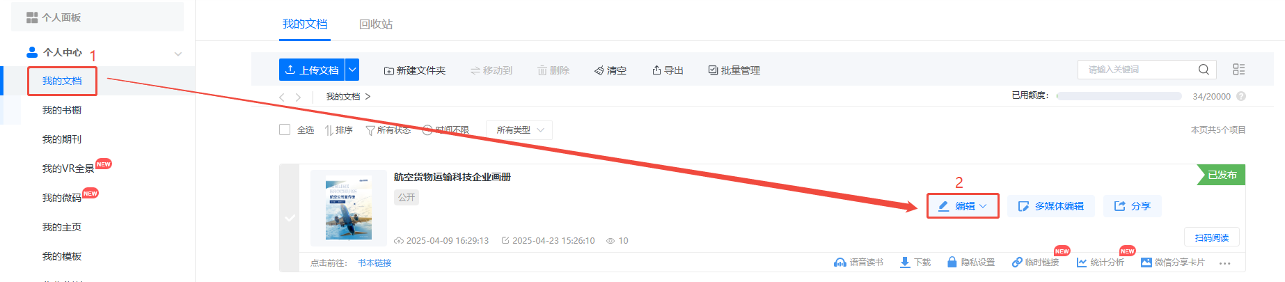 點(diǎn)擊【我的文檔】,找到對應(yīng)的電子畫冊,點(diǎn)擊【編輯】,打開編輯界面。
