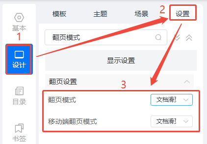 點(diǎn)擊【設(shè)計】,然后點(diǎn)擊【設(shè)置】,將【翻頁模式】和【移動端翻頁模式】改成文檔翻頁。