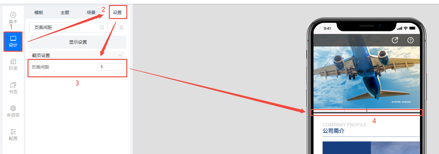 點(diǎn)擊【設(shè)計】,然后點(diǎn)擊【設(shè)置】,設(shè)置【頁面間距】,頁面間距就是兩頁之間的距離,建議設(shè)置為【5】。