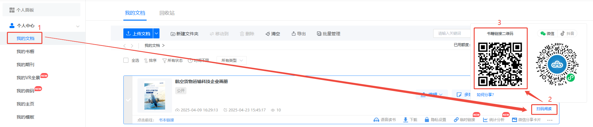 在【我的文檔】頁面,點(diǎn)擊【掃碼閱讀】,找到書籍鏈接二維碼。