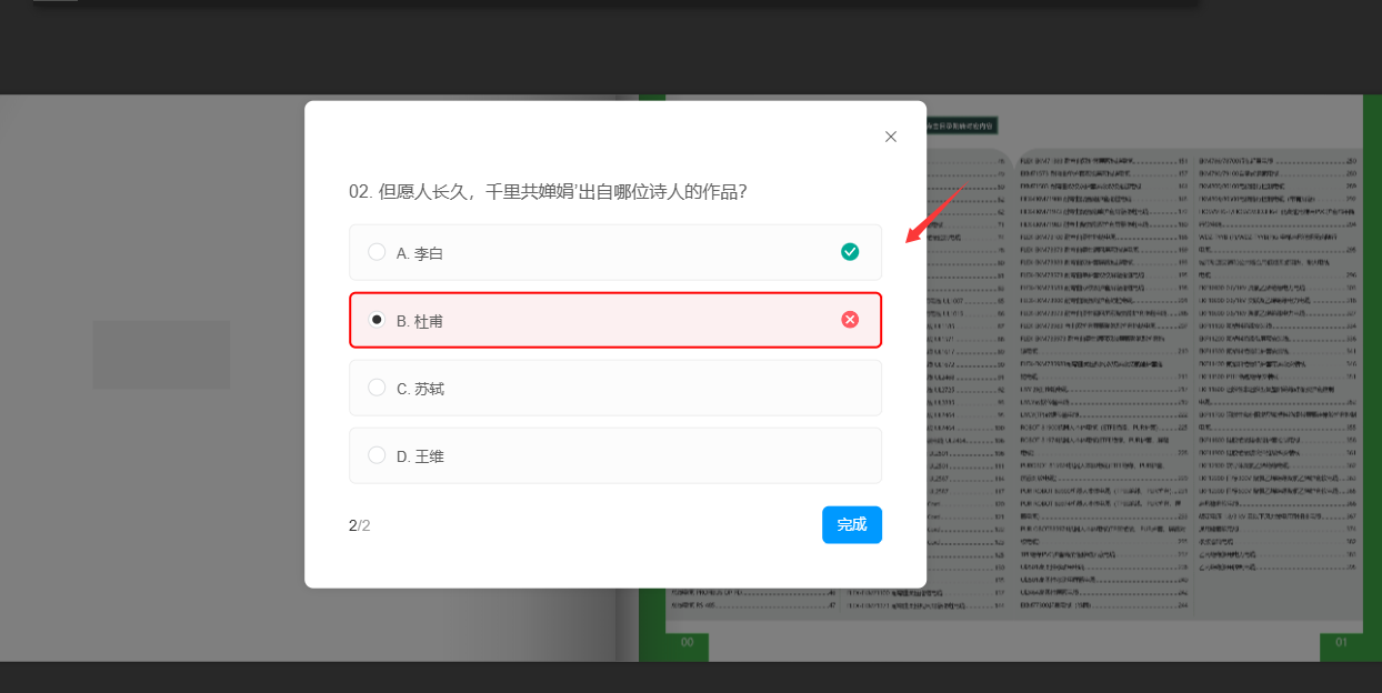 此功能適用于電子教科書和電子教輔書,可以在書中的文字或者圖片添加超鏈接,點(diǎn)擊彈出選擇題題目,給讀者進(jìn)行答題測驗(yàn),讀者提交答案后可即時(shí)獲得”正確”或”錯(cuò)誤”的反饋。