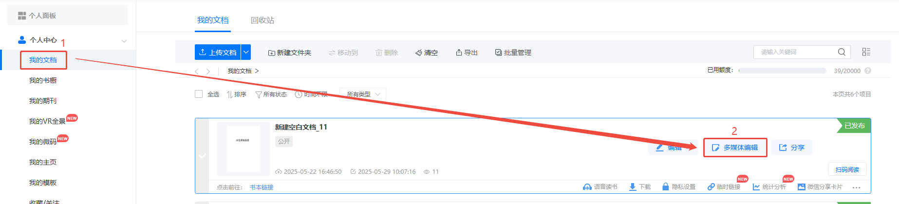 點(diǎn)進(jìn)【我的文檔】/【文檔】,選擇對(duì)應(yīng)電子書,點(diǎn)擊【多媒體編輯】/【內(nèi)容編輯】。