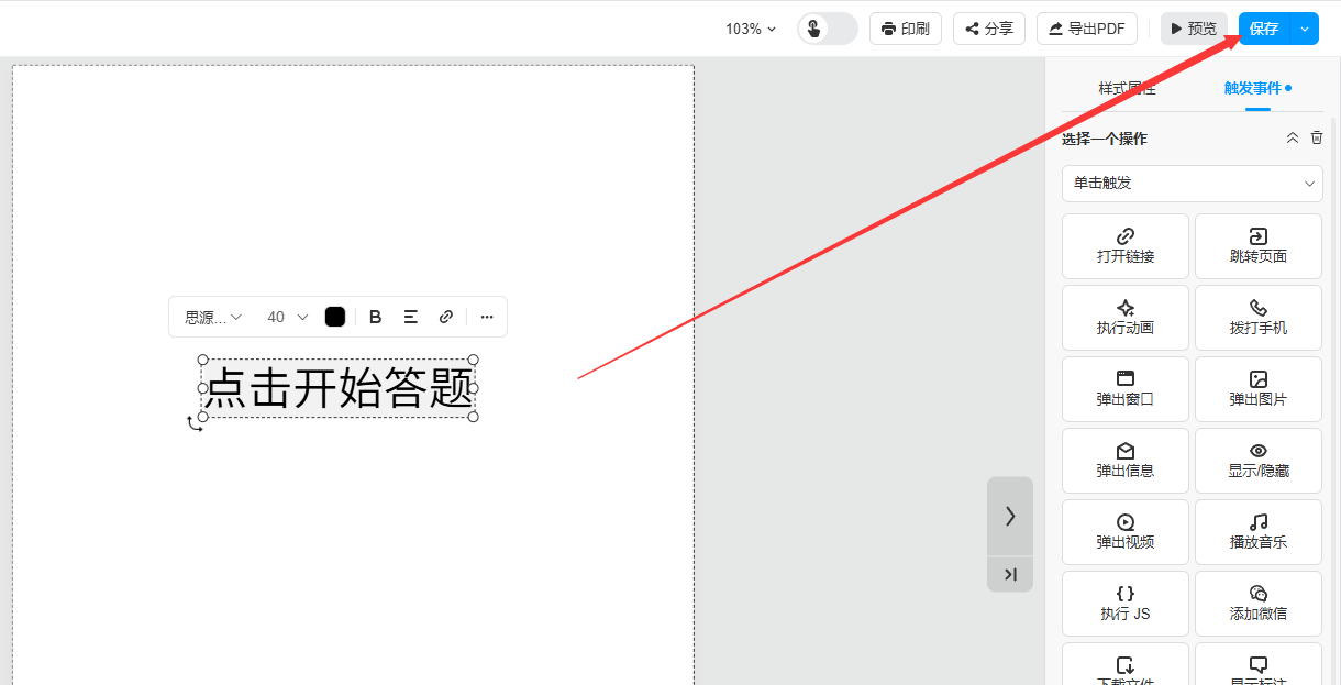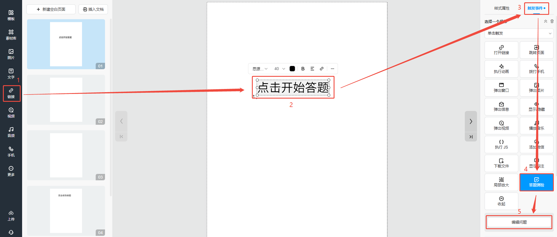 點(diǎn)擊【鏈接】,將出現(xiàn)在頁面上超鏈接放置到文字或者圖片上,點(diǎn)擊右上角【觸發(fā)事件】,選擇【答題測驗(yàn)】,點(diǎn)擊【編輯問題】。
