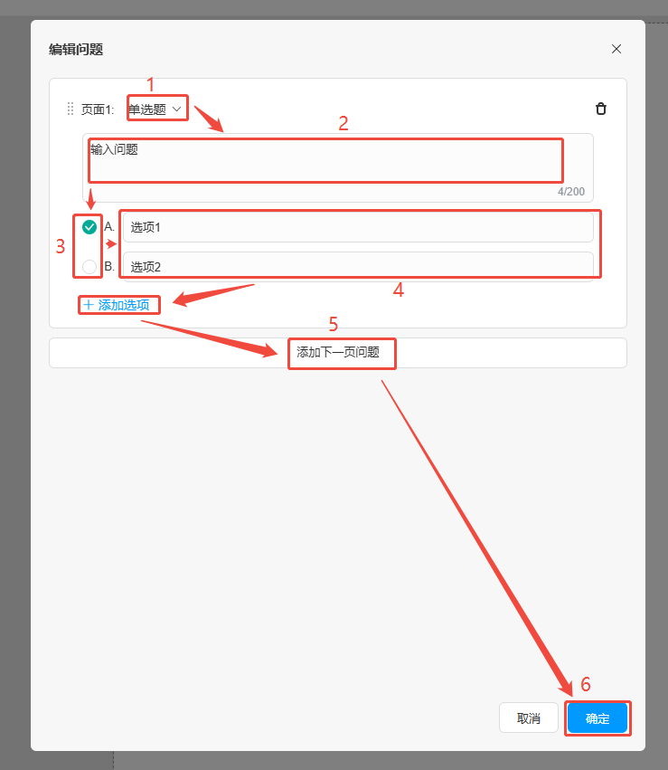 在【單選題】選擇題目為單選題或者多選題,下方輸入問題題目,勾選其中一個(gè)選項(xiàng)為正確答案(如果是多選題可勾選多個(gè)),右側(cè)編輯選項(xiàng),如果想要增加多個(gè)選項(xiàng),可以點(diǎn)擊【+添加選項(xiàng)】增加,如果需要添加多個(gè)問題,可以點(diǎn)擊【添加下一頁問題】,全都編輯好之后點(diǎn)擊【確定】。