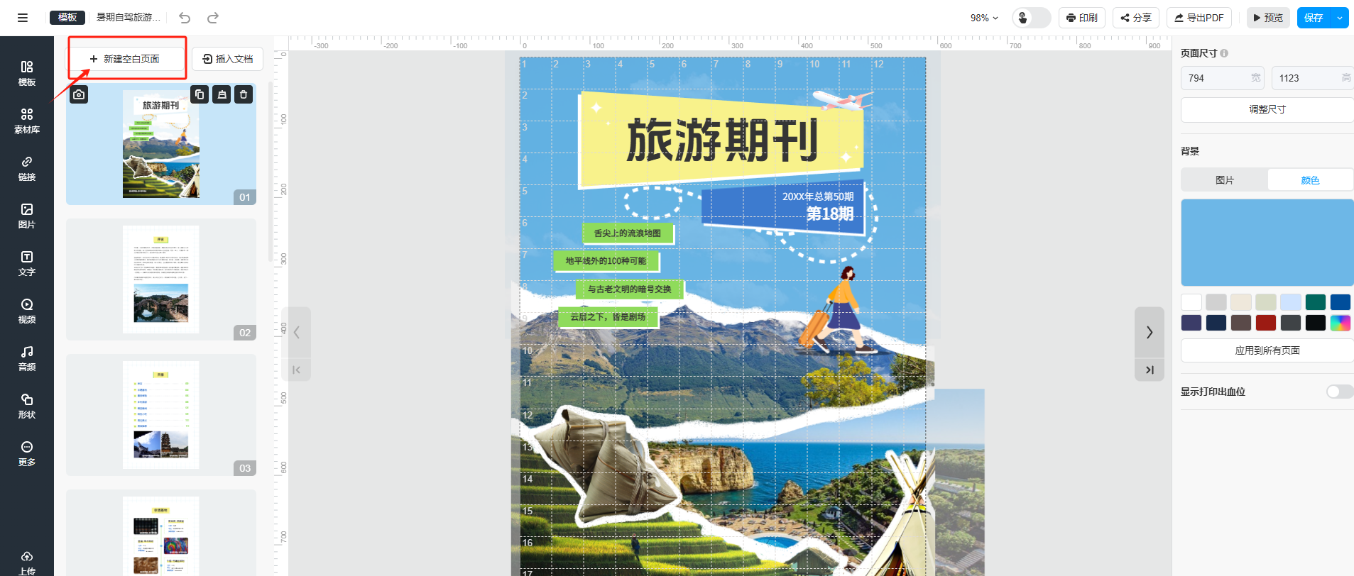 (2)進(jìn)入編輯器頁面后,點擊【新建空白頁面】,新增一頁空白頁可以自由編輯