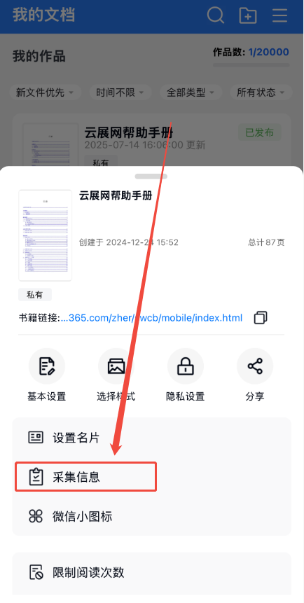 點(diǎn)擊【作品】,點(diǎn)擊對應(yīng)電子書右邊的三個點(diǎn),然后點(diǎn)擊【采集信息】,打開采集信息界面。