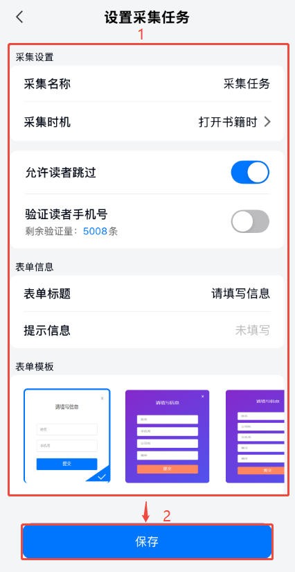 為了提高作者跟讀者之間的互動溝通,我們開發(fā)了采集信息功能,通過應(yīng)用不同模板,您可以要求讀者填寫他的名字,手機(jī)號,微信號等才能繼續(xù)閱讀書本/書櫥,不僅可以獲取潛在有意向的客戶數(shù)據(jù),還可以提高您與讀者之間的交互。