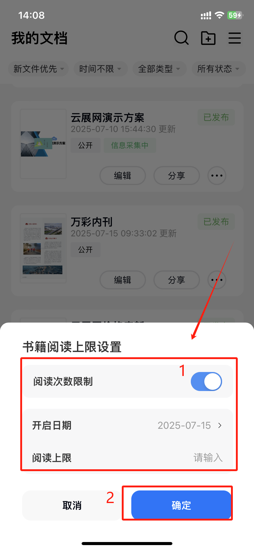 開啟【閱讀次數(shù)限制】,設置【開啟日期】以及設置【閱讀上限】次數(shù),設置好后,點擊【確定】