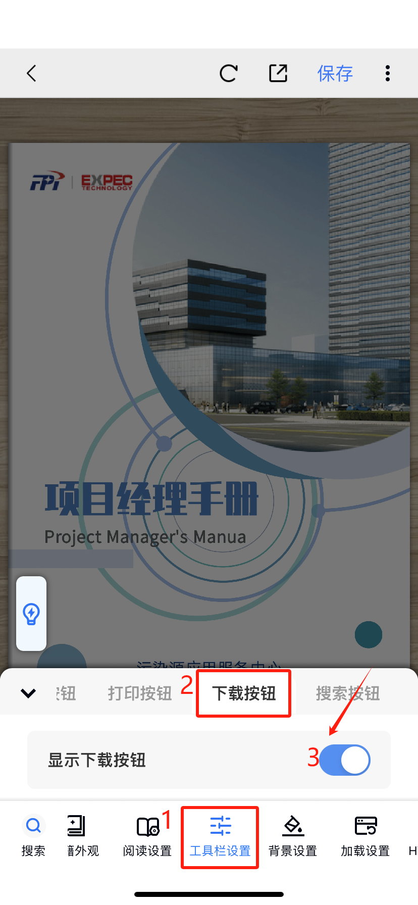 在底部菜單欄【工具欄設(shè)置】上,找到【下載按鈕】點(diǎn)擊,開啟【顯示下載按鈕】