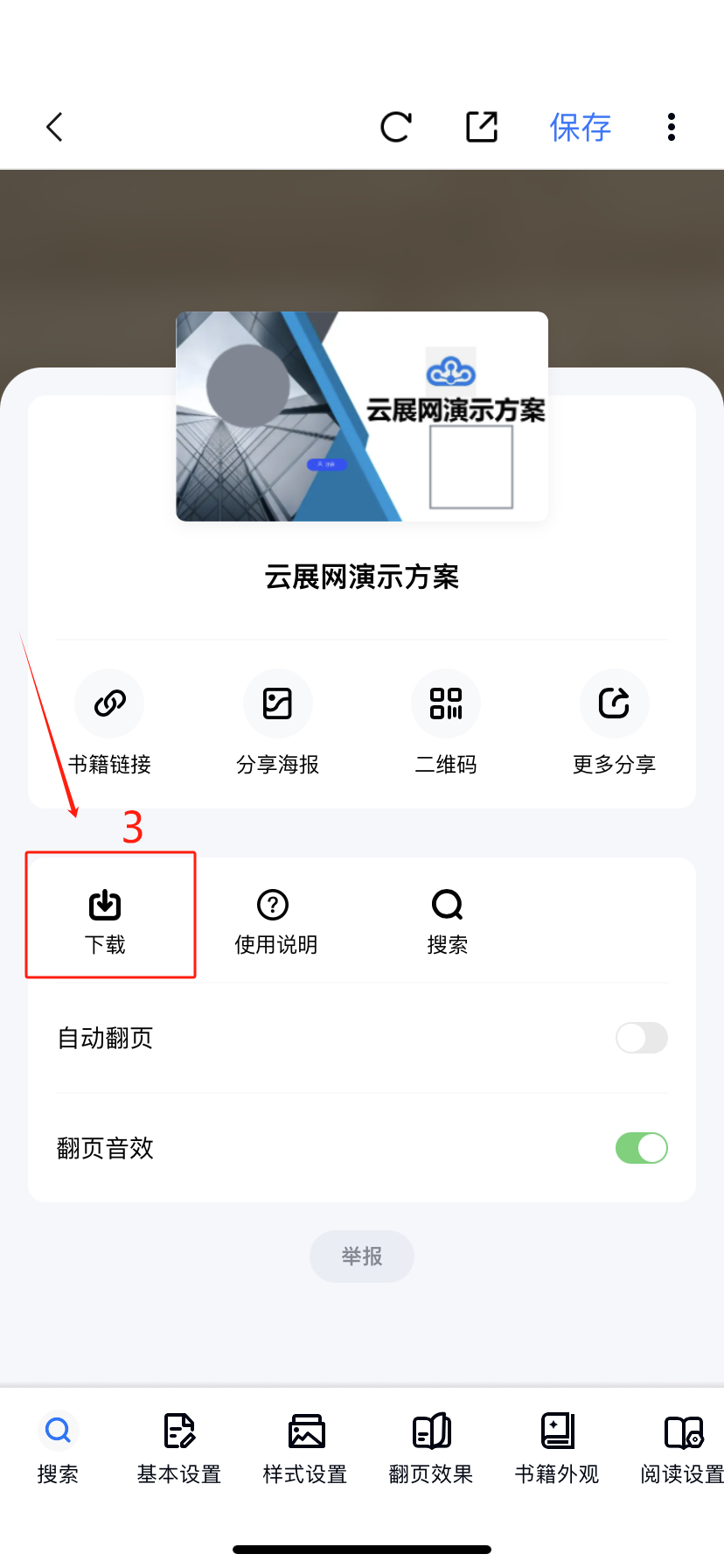 設(shè)置好后點(diǎn)擊右上角的【保存】,然后點(diǎn)擊工具欄上的【…】按鈕,點(diǎn)擊【下載】按鈕即可下載書本文件