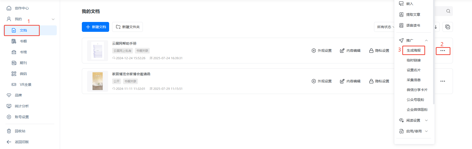 點(diǎn)擊【文檔】,然后點(diǎn)擊對(duì)應(yīng)電子書的右邊三個(gè)點(diǎn),再點(diǎn)擊【推廣】,最后點(diǎn)擊【生成海報(bào)】。