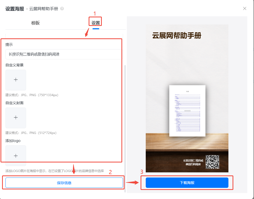 點(diǎn)擊【設(shè)置】,下方輸入海報(bào)信息,點(diǎn)擊【保存信息】即可保存,最后點(diǎn)擊右側(cè)【下載海報(bào)】即可下載下來。