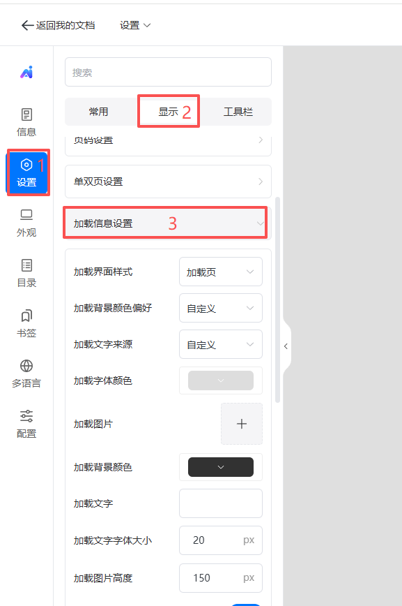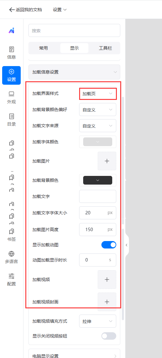 點擊【設(shè)置】,點擊【顯示】,找到【加載信息設(shè)置】打開。