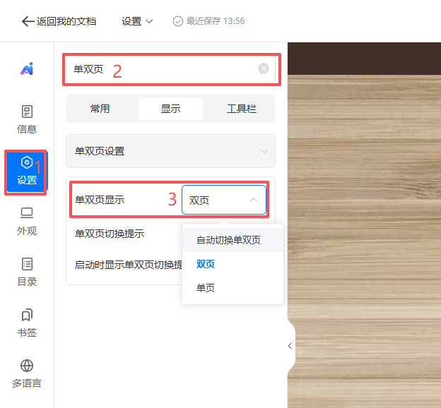 點(diǎn)擊【設(shè)置】,在搜索欄輸入“單雙頁(yè)”,【單雙頁(yè)顯示】選擇“雙頁(yè)”即可。