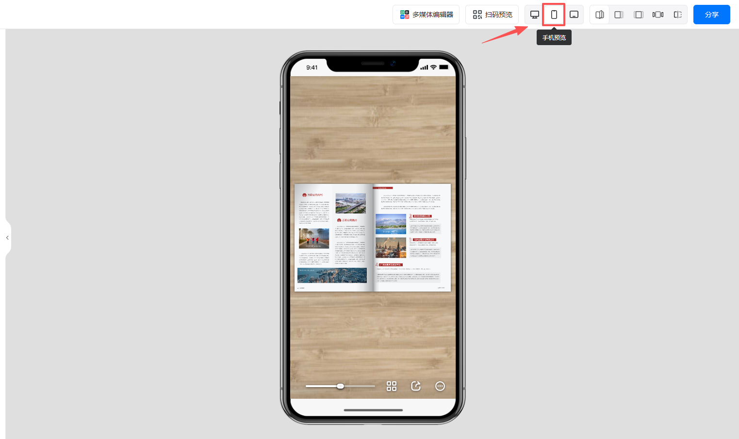 點(diǎn)擊右上角的手機(jī)預(yù)覽按鈕,可查看手機(jī)端豎屏雙頁(yè)效果
