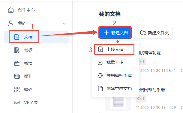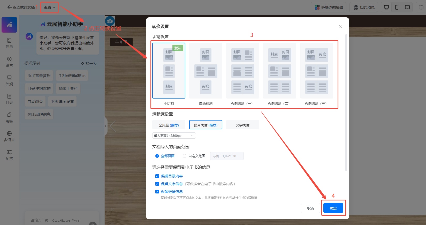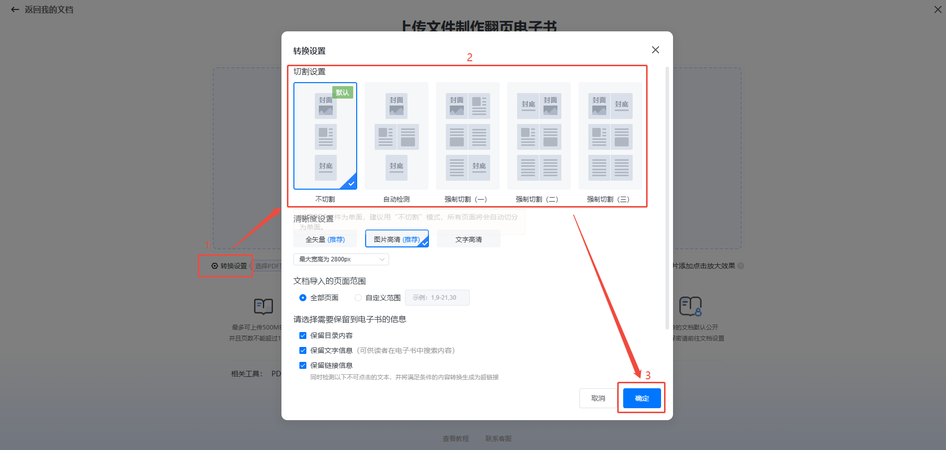 在【文檔】頁(yè)面,點(diǎn)擊【新建文檔】里面的【上傳文檔】,點(diǎn)擊【轉(zhuǎn)換設(shè)置】,選擇切割方式后點(diǎn)擊【確定】。