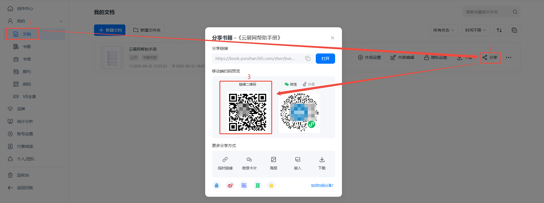 在【文檔】頁(yè)面,點(diǎn)擊【分享】,找到鏈接二維碼。