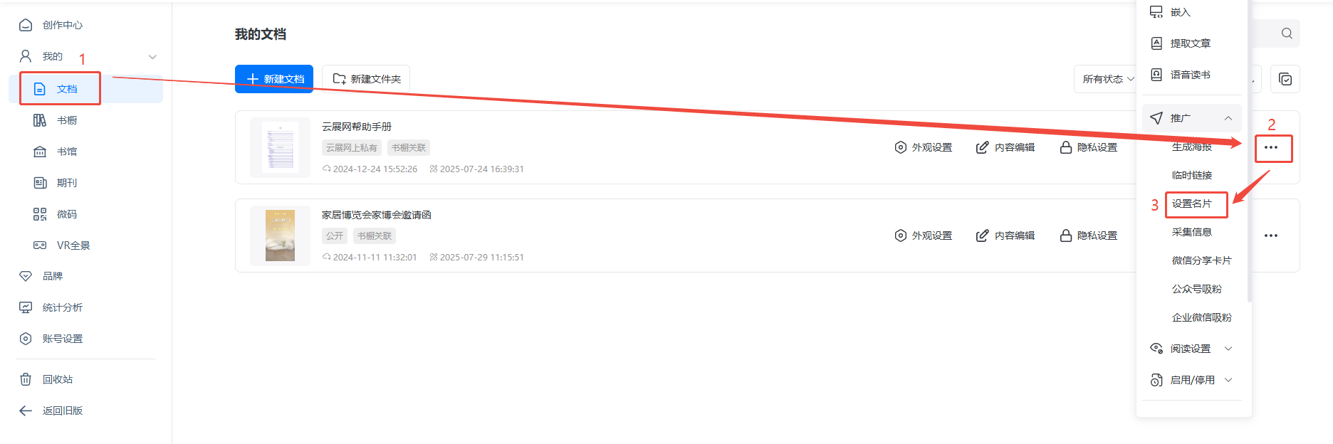點(diǎn)擊【文檔】,選擇需要的電子書,點(diǎn)擊右邊三個(gè)點(diǎn),選擇【推廣】,點(diǎn)擊【設(shè)置名片】,打開名片設(shè)置界面。