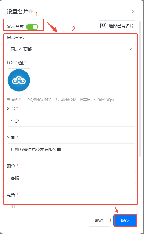 打開【顯示名片】,選擇一個(gè)【展示形式】,下方上傳logo輸入對(duì)應(yīng)信息后,點(diǎn)擊保存即可。