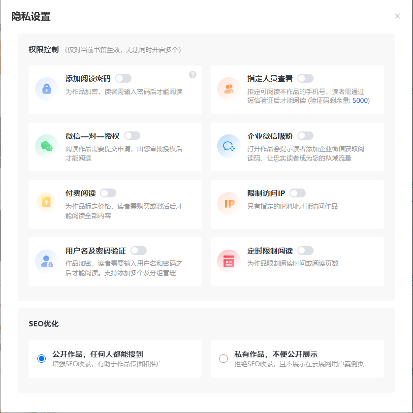 電子雜志隱私設(shè)置有10種:添加閱讀密碼、指定人員查看、企業(yè)微信吸粉、微信一對(duì)一授權(quán)閱讀、付費(fèi)閱讀、限制訪問IP、用戶名及密碼驗(yàn)證、定時(shí)限制閱讀、在云展網(wǎng)上私有、網(wǎng)站上公開。
