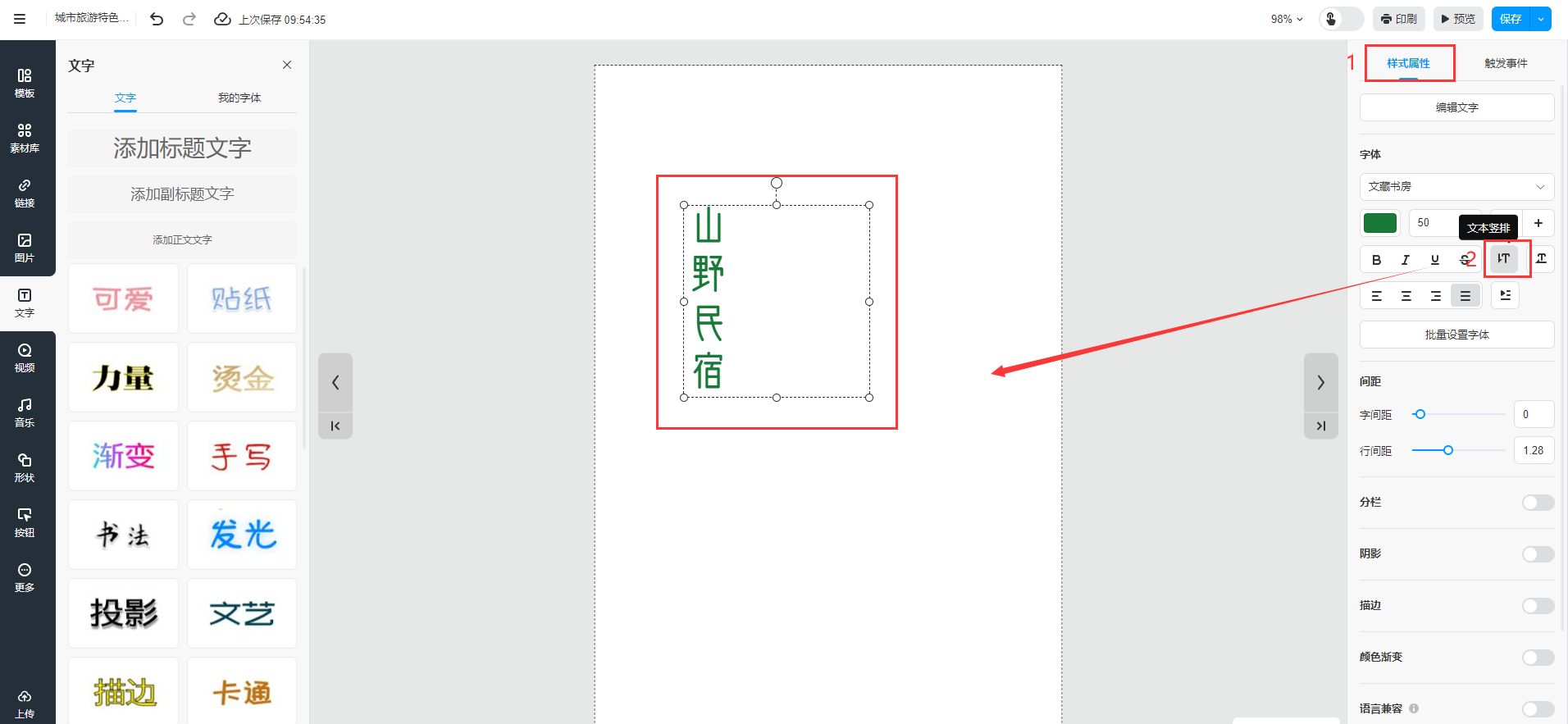 選中文本內(nèi)容進入【樣式屬性】,點擊【文本豎排】即完成。