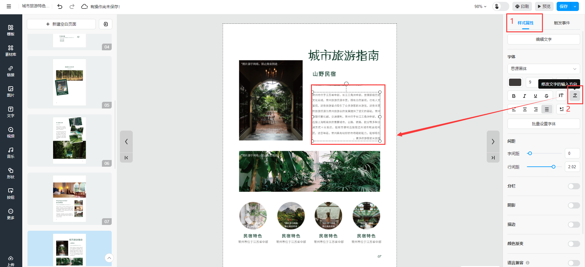 選中文本內(nèi)容進入【樣式屬性】,點擊【修改文字的輸入方向】即完成。
