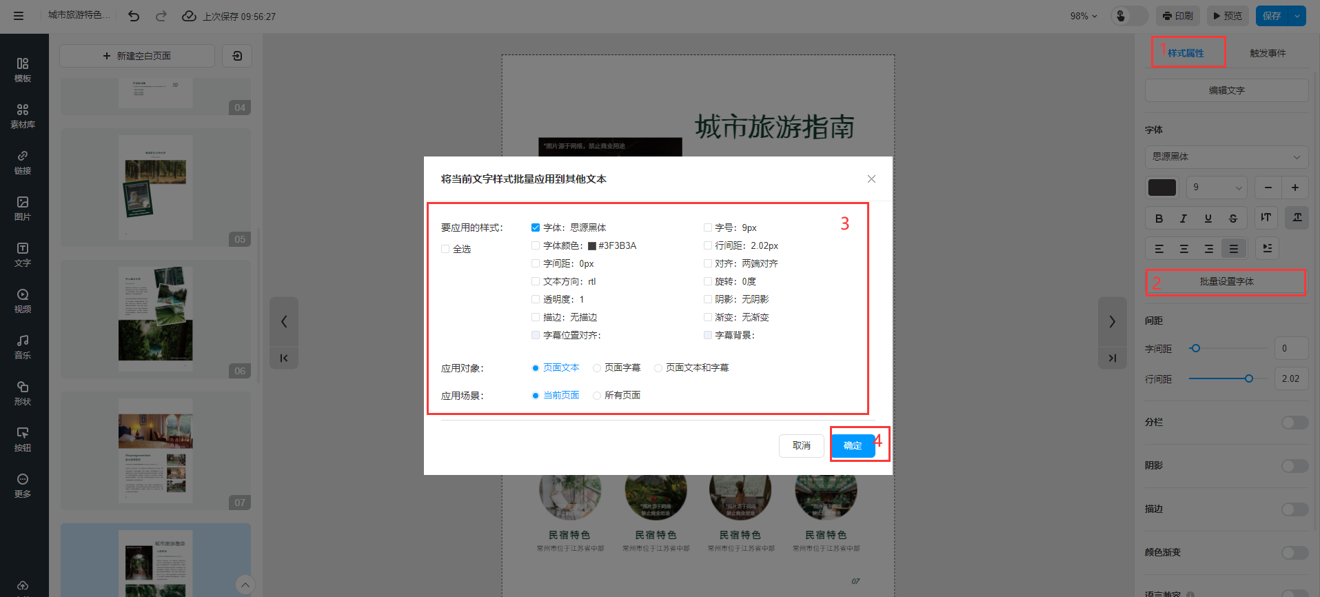 選中文本內(nèi)容進入【樣式屬性】,點擊【批量設(shè)置字體】,勾選要應(yīng)用的樣式、對象以及場景,并點擊【確定】完成批量應(yīng)用。