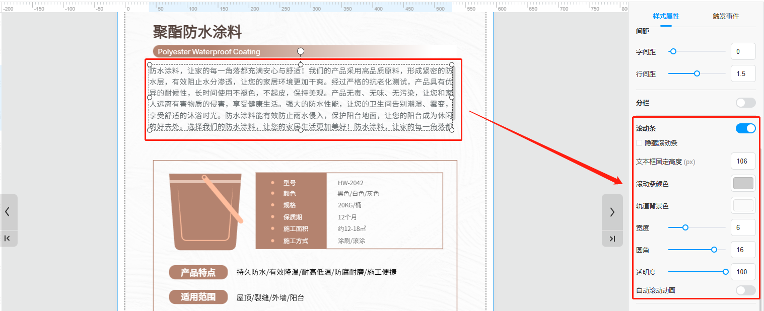 當文字段落太長,又不想它占據(jù)頁面太多面積時,可以選中文本框并打開【滾動條】,這樣可以縮小文本框的面積,讀者可以滑動觀看后面的內(nèi)容。