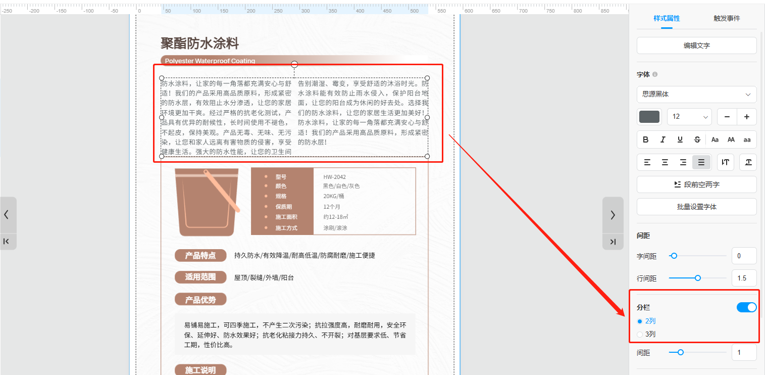 選中你所需要修改的文本框,打開【分欄】,文字段落會自動分成對應(yīng)數(shù)量的欄目。