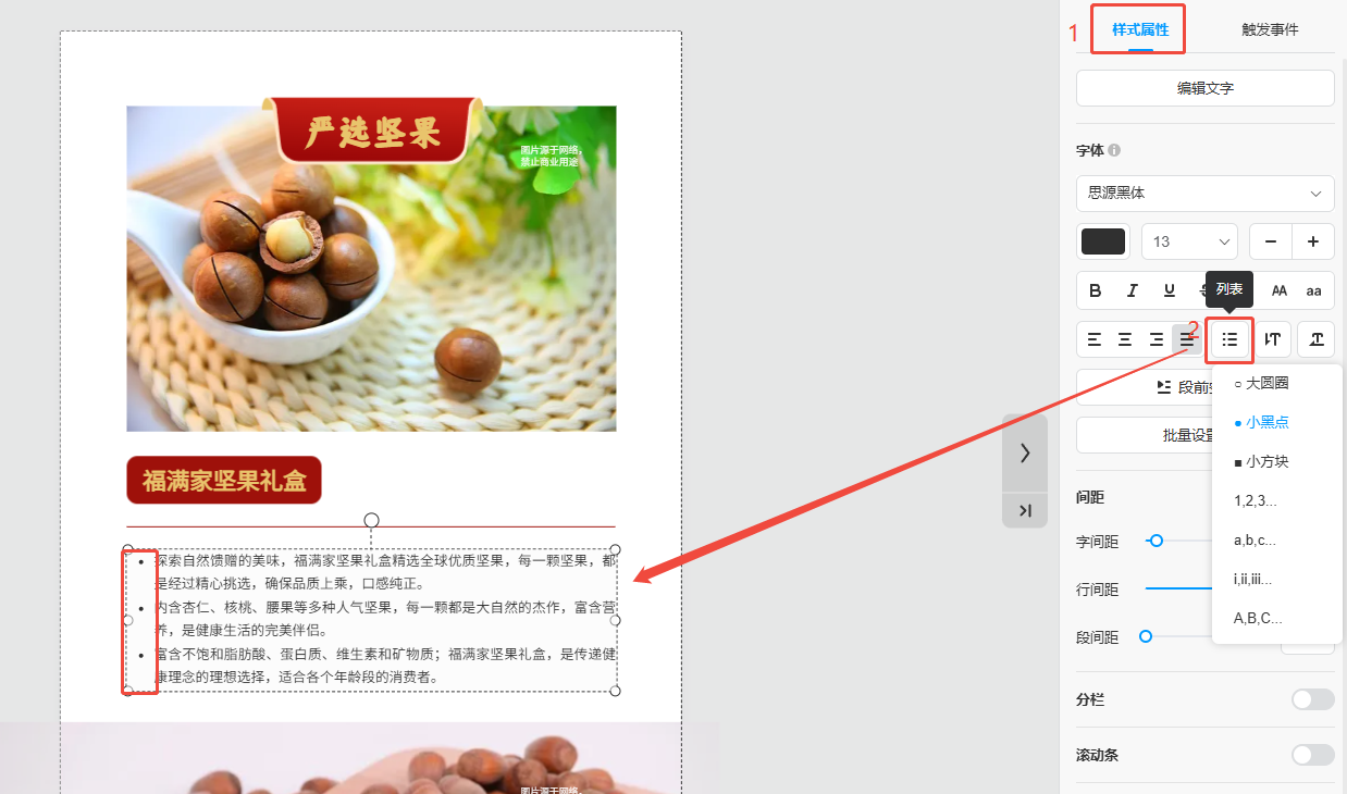 雙擊文本框進入編輯狀態(tài),點擊【列表】選擇符號樣式,文本里的每一段前面將會添加一個符號。