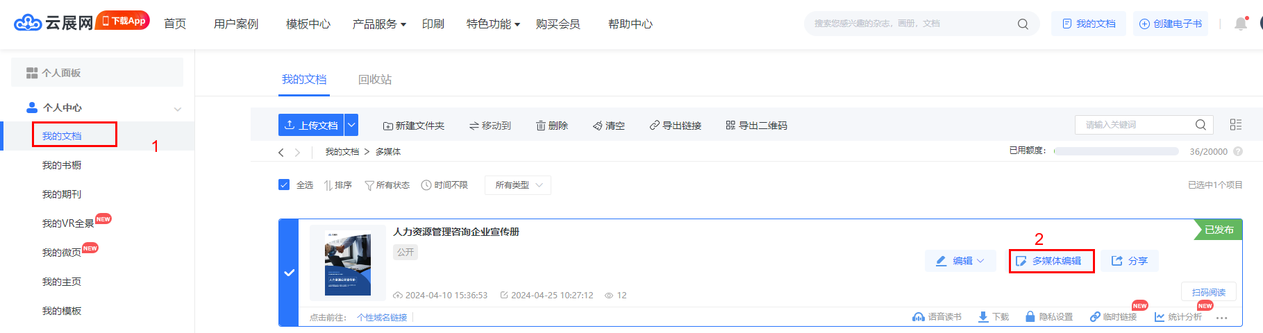 點(diǎn)進(jìn)【我的文檔】/【文檔】,選擇對(duì)應(yīng)電子書(shū),點(diǎn)擊【多媒體編輯】/【內(nèi)容編輯】。