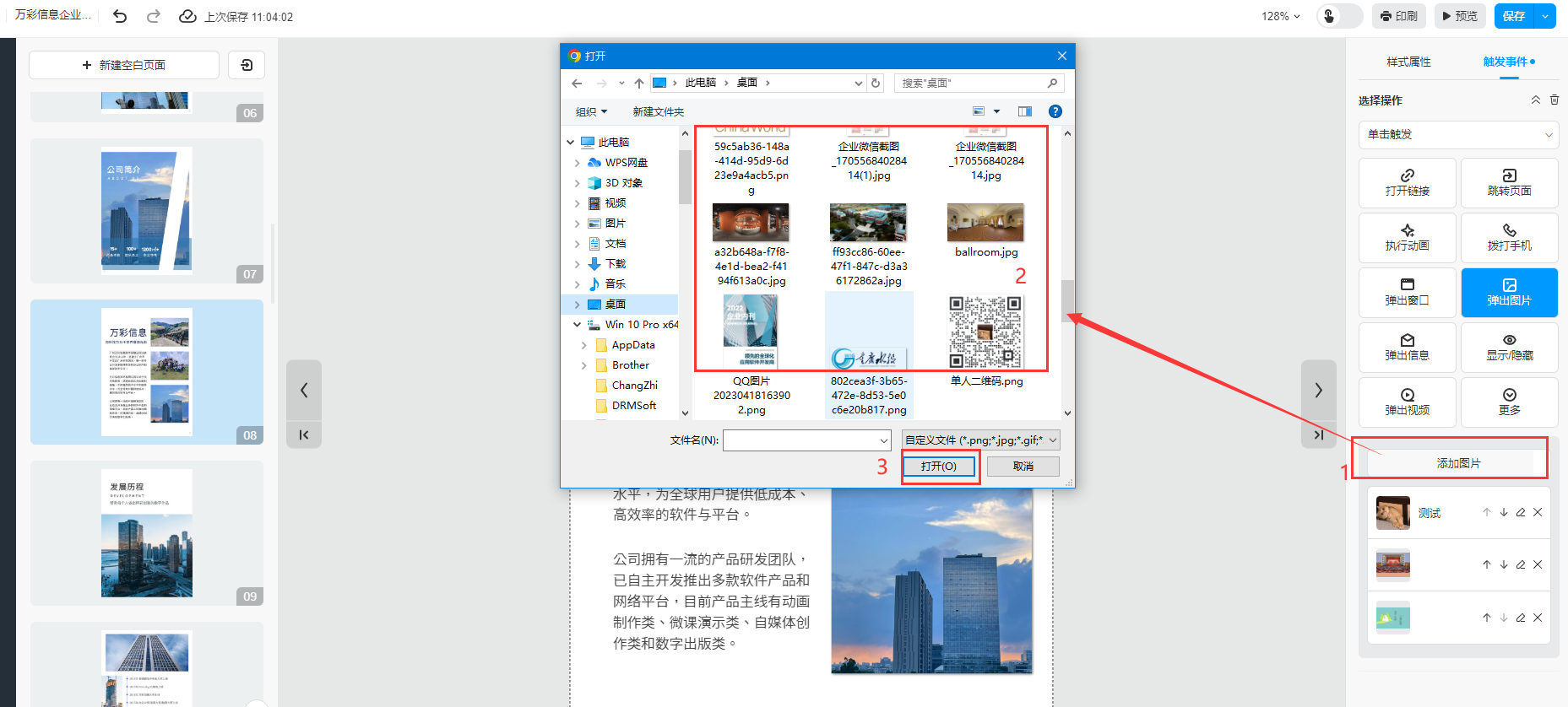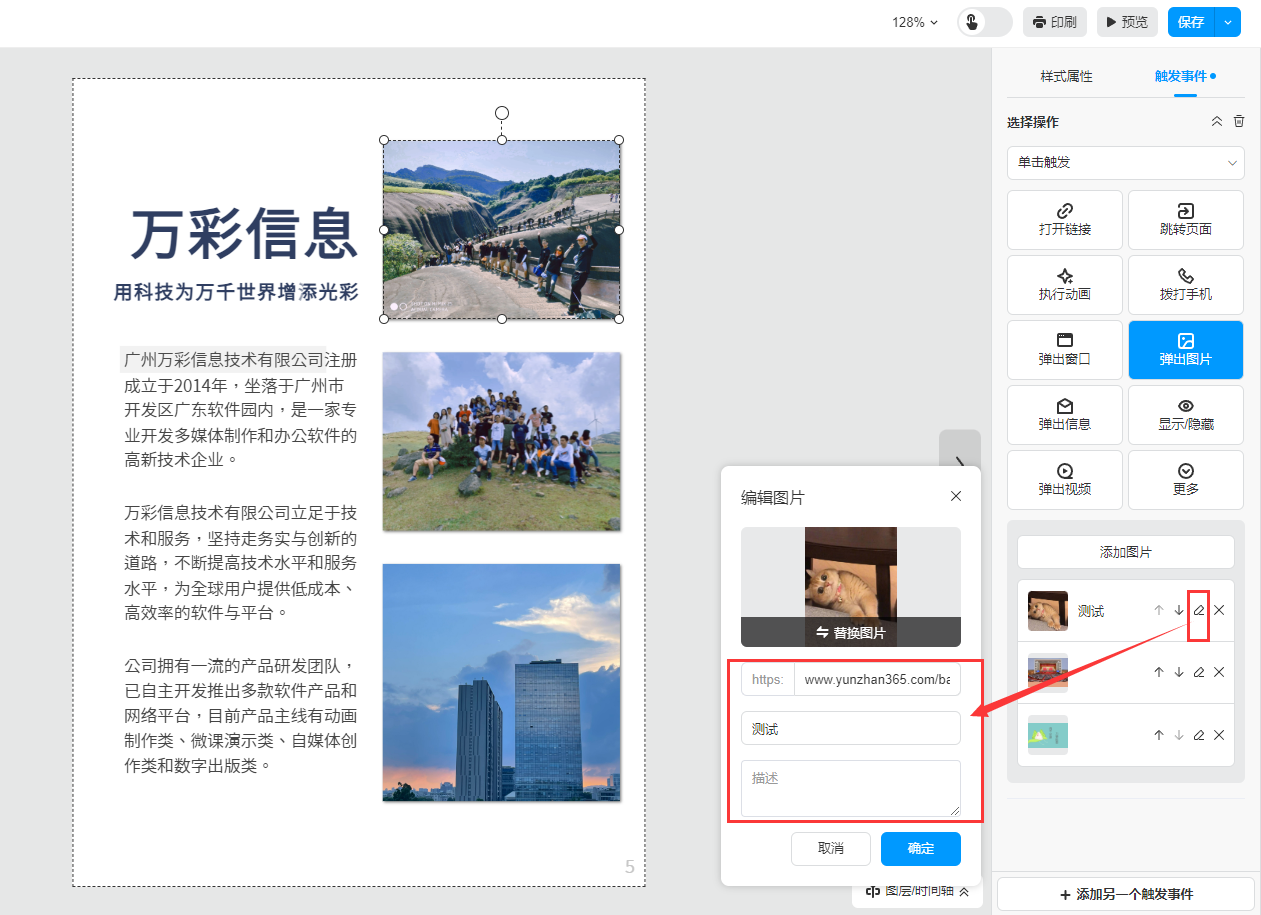 ①、選中需要彈出圖片的位置,可以是文字或者圖片,然后點擊【觸發(fā)事件】選擇【彈出圖片】