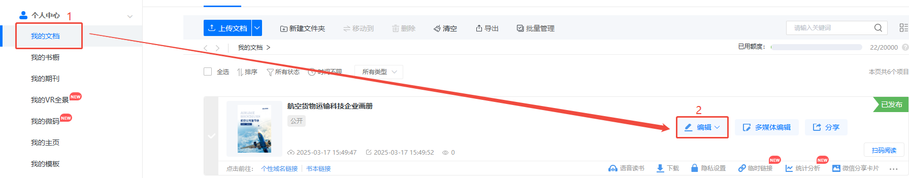點(diǎn)擊【我的文檔】,然后點(diǎn)擊【編輯】,打開編輯界面。
