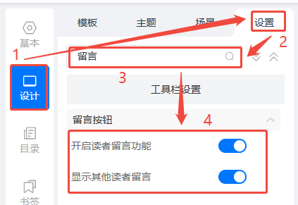 點(diǎn)擊【設(shè)計(jì)】,然后點(diǎn)擊【設(shè)置】,搜索欄搜索【留言】,將【開啟讀者留言功能】和【顯示其他讀者留言】打開。