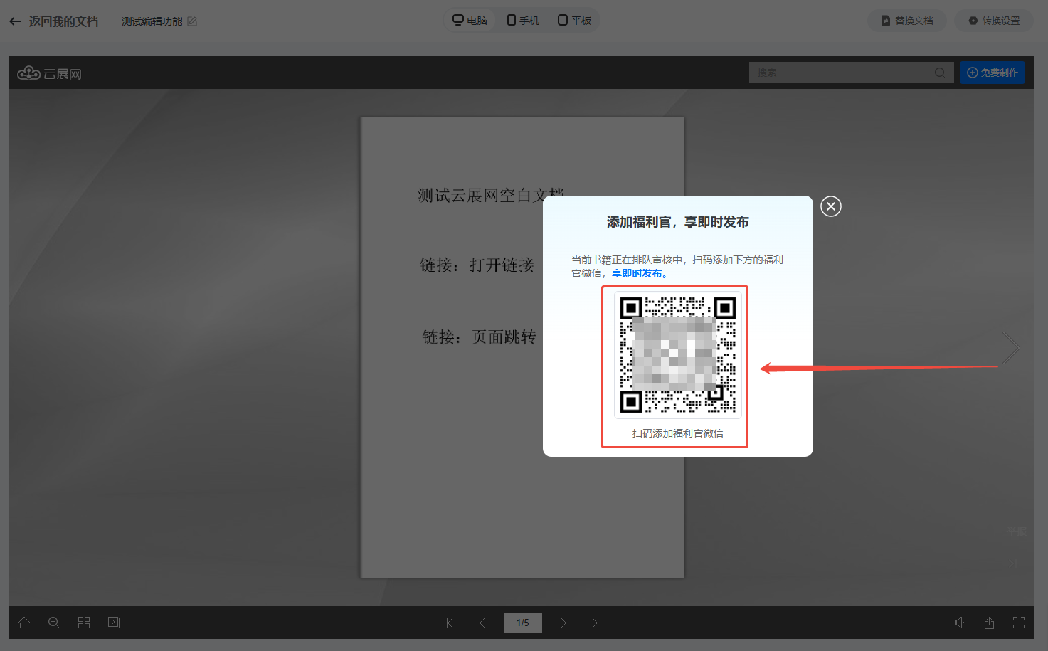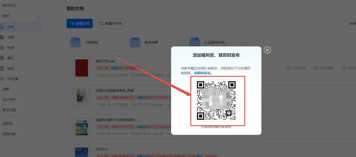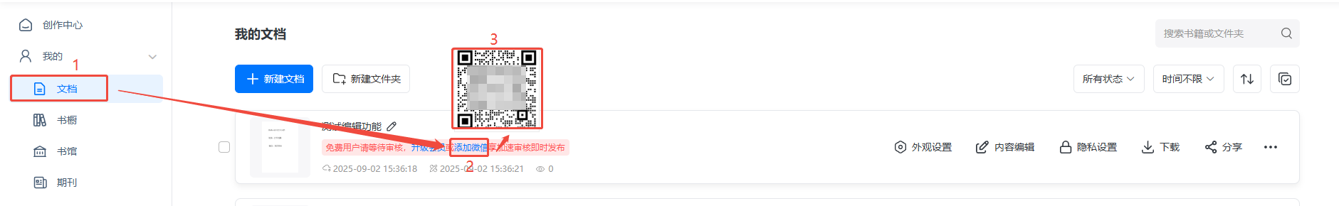 (2)點(diǎn)擊【文檔】找到正在審核中的電子書,鼠標(biāo)移動到藍(lán)色字體【添加微信】會顯示出微信二維碼,掃碼添加即可。