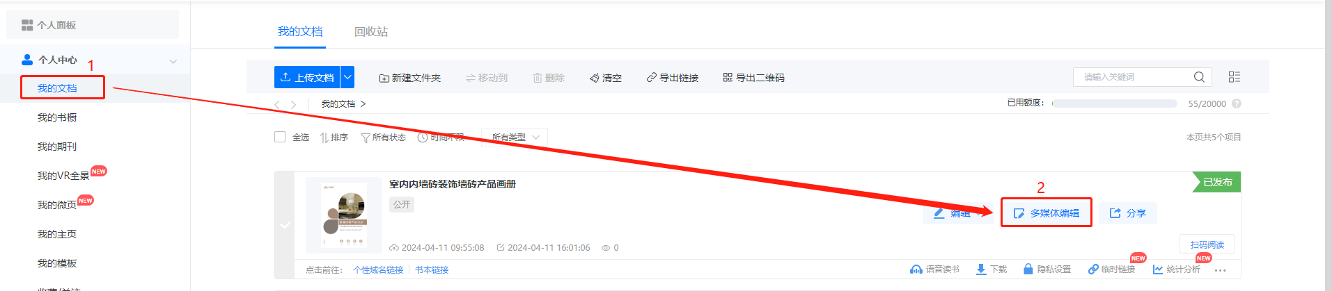點(diǎn)進(jìn)【我的文檔】/【文檔】,選擇對(duì)應(yīng)電子書,點(diǎn)擊【多媒體編輯】/【內(nèi)容編輯】。